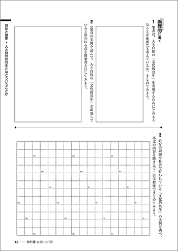 「論理的に書く」では、教科書掲載の言語活動のうち、「書くこと」の学習に関連する課題を取り上げて、書き方の具体的な手順を示しています。