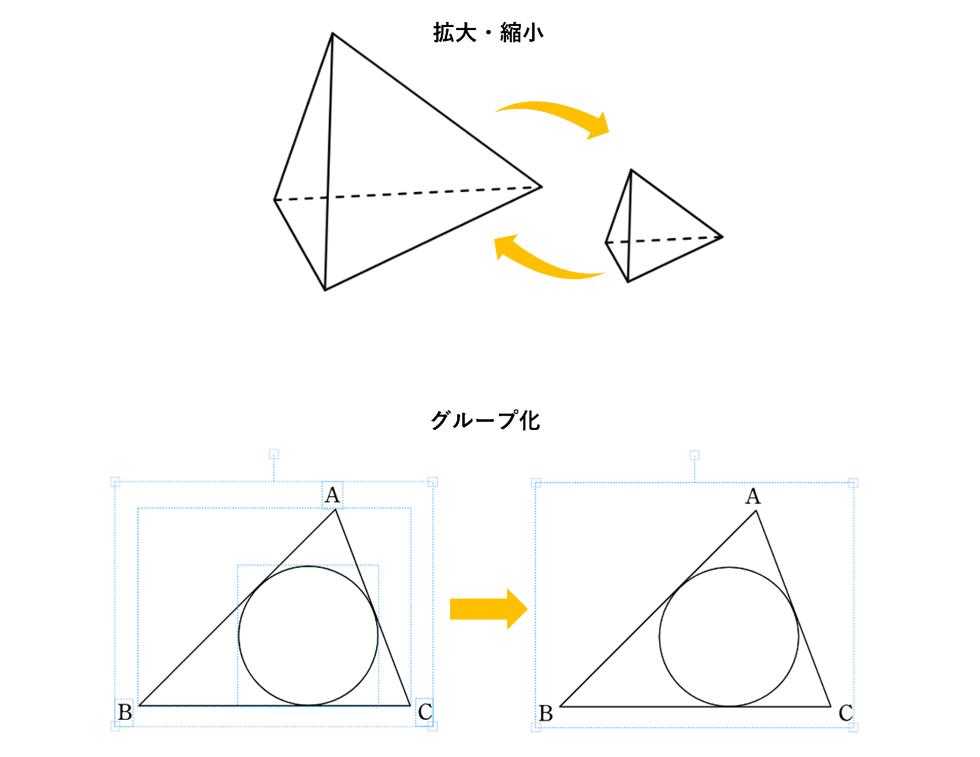 - 図形の拡大、縮小、グループ化ができるようになりました。
