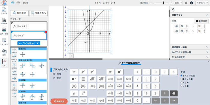 検索してレイアウトした問題や、デスクトップアプリ版、Studyaid D.B.(DVD-ROM版)で作成したプリントの関数グラフも編集することができます。