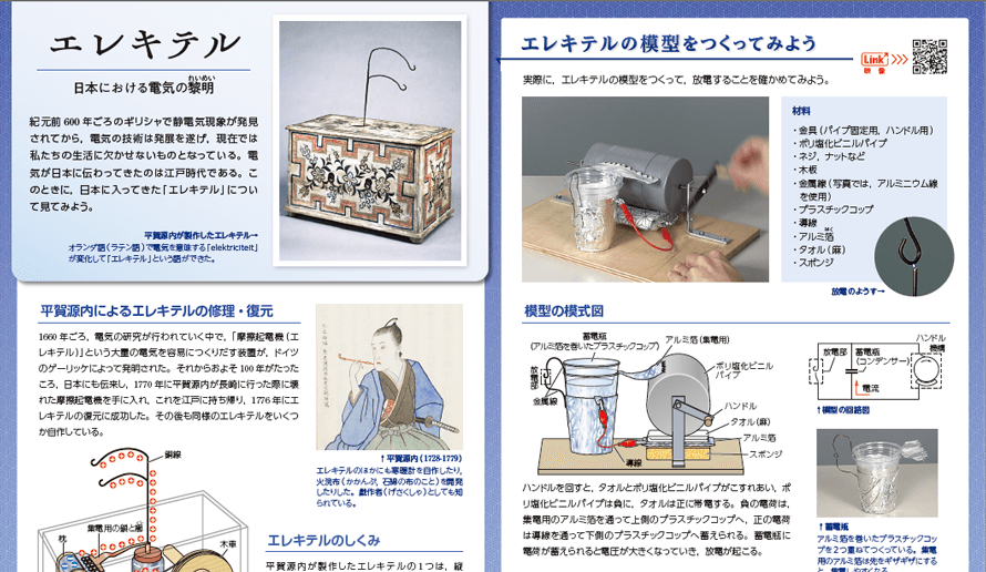 平賀源内が制作した「エレキテル」について紹介する記事を後見返しに掲載。身近にある材料でエレキテルの模型をつくれることも紹介し,工学的な学びへとつなげられます。