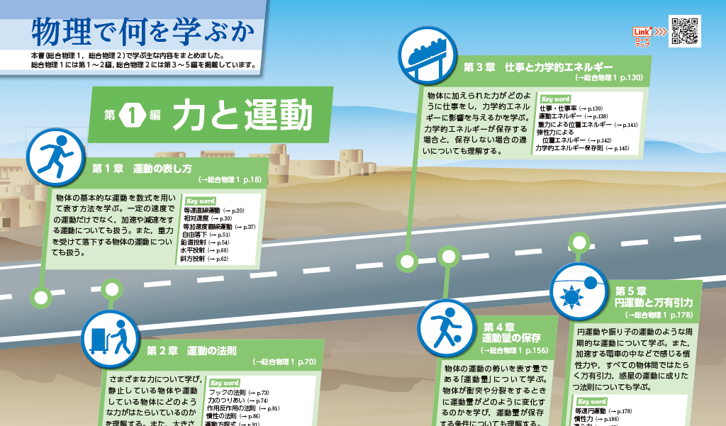 「物理基礎」と「物理」の内容を融合し,分野別に再構成することによって,学びやすくなっています。
