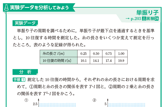 与えられたデータから表やグラフをかいたり,結果から読み取れることを記述させたりする囲み要素「実験データを分析してみよう」を新設。