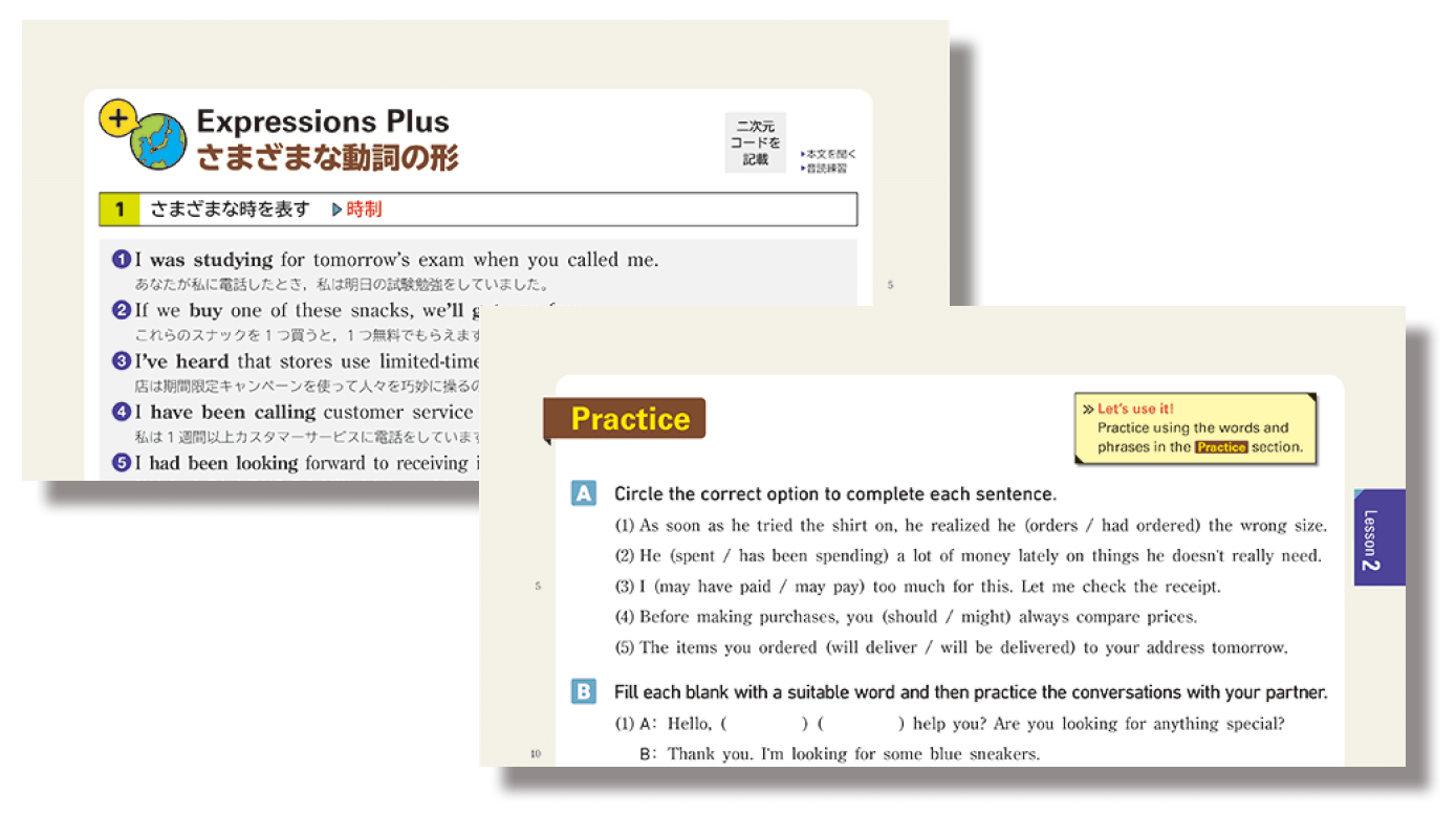 巻末にあった文法のまとめ「Expressions Plus」を,改訂版では各課に配置。文法の練習問題のPracticeも新たに設けました。