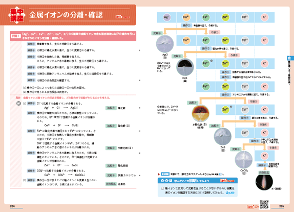 必ず押さえておきたい「金属イオンの分離・確認」・「有機化合物の分離」の例題は,図を用いてていねいに解説しました。