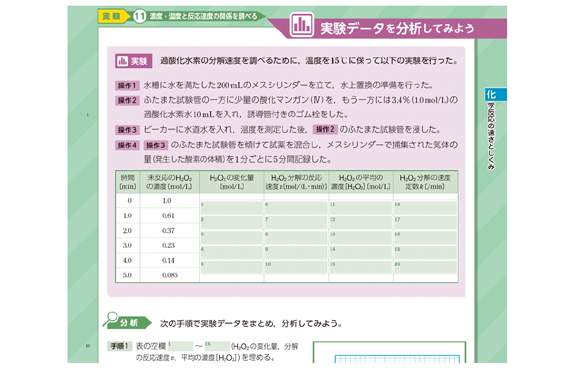 データ処理が必要な実験では,「実験データを分析してみよう」をセットで扱いました。示された実験データの例をもとにして,データ処理の方法を身につけられるようにしました。