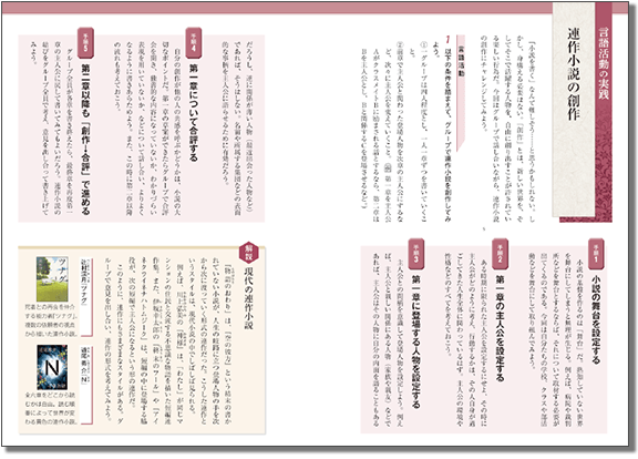題材理解を深めるための言語活動課題とともに、その活動を実施するための手順やヒントを解説しました。「文学的文章の創作」の単元では、グループで連作小説を創作する言語活動課題を設定しています。
