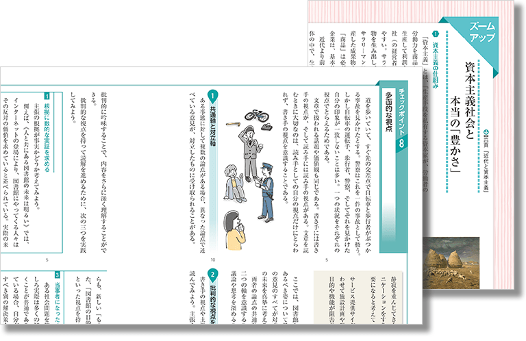 「ズームアップ」では評論テーマを、「チェックポイント」では読解・表現スキルを解説。比較読解用の文章も充実しています。