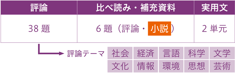 さまざまな現代的なテーマの文章、比較読解用の文章のほか、補充資料として小説も収録しています。