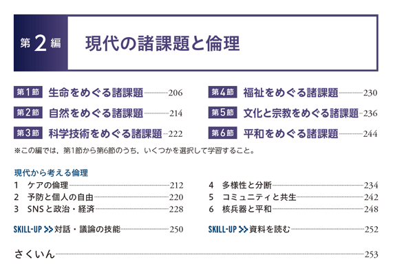 生命・自然・科学技術,福祉・文化・宗教・平和をめぐる現代の倫理的諸課題を学習し,第1編で学んだ先哲の基本的な考え方を活用しながら現代の社会について考察します。