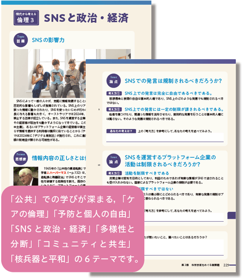 本文の知識を補足する「CLOSE-UP」「SKILL-UP」, 身近な話題や現代のニュースから倫理的諸課題を探究する「Thinking Time」「現代から考える倫理」と,充実したコラムを用意しています。