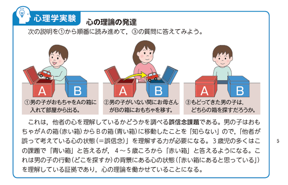 心理学分野では,「公共」で学習した青年期の内容を含む「発達の心理学」を冒頭に置いて,「公共」からのつながりに配慮しました。また,共通テストの趣旨をふまえた図版や「心理学実験」のコーナーを随所に設けました。