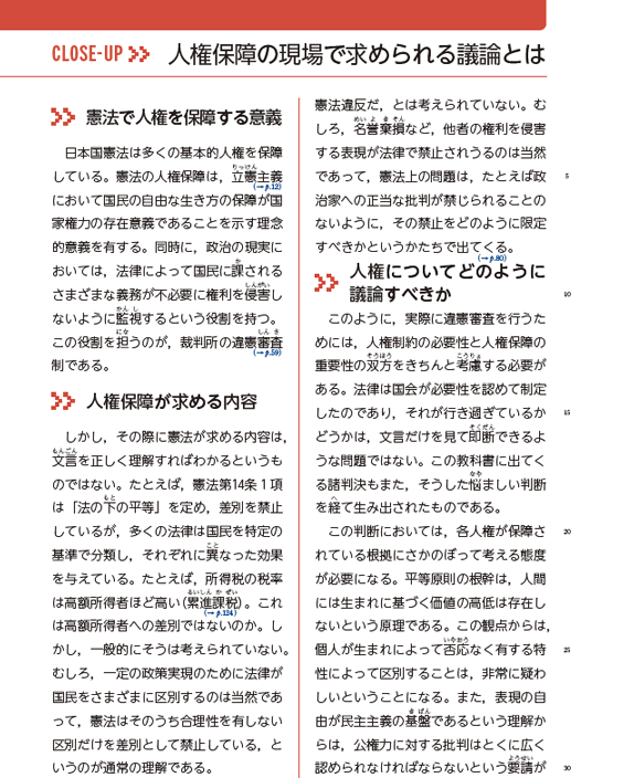 「公共」でも学習する日本国憲法の基本的人権について,既習の基本的知識を前提としつつ,人権保障が求める内容や,人権についてどのように議論すべきかということについて言及しています。