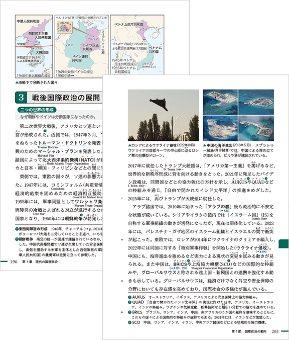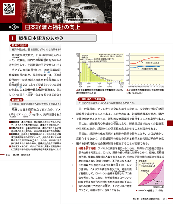 「戦後日本経済のあゆみ」や「戦後国際政治の展開」などについては,「公共」での学習をふまえつつ,本文と図版でさらに丁寧に説明しています。