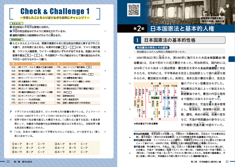 各節で学習した内容についてふり返るコーナー。「Check」では文章を書くことによって基本的な知識を確認。「Challenge」では知識や技能を活用しながら問題を解くことによって思考力を養成。