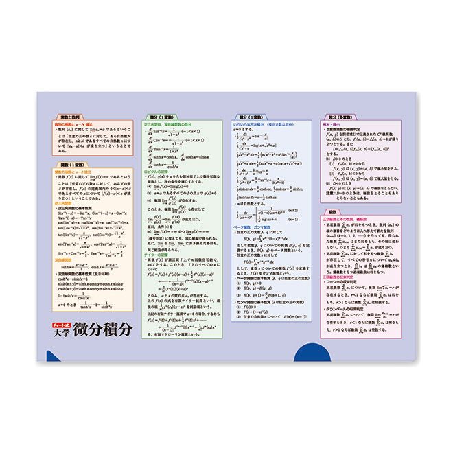 大学数学の教材の発行を記念して、大学数学で学ぶ「微分積分」の定理や公式をまとめた、とても便利なクリアファイルが登場!単元ごとにまとめてあり、手軽に確認できて重宝するかも!?